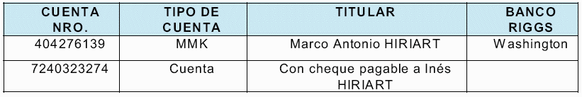 - Carta de fecha en California el 03 de junio de 1984, enviada por José Ramón UGARTE, cuya firma corresponde a la de Augusto PINOCHET UGARTE, dirigida a Víctor C. BALESTRA, Vicepresidente y General Manager del Riggs International Banking Corporation Miami, Florida, donde le instruye cerrar la cuenta corriente N° 35008 y que los depósitos deben ser entregados a Marco A. HIRIART, en tres cheques a la vista o vale vista, a nombre del Sr. HIRIART, por US$120.000, US$130.000 y, el último con el saldo de la liquidación. Por ello, se presenta ante el Banco Riggs un mandato de José Ramón UGARTE donde otorga poder a Marco A. HIRIART para que retire el saldo de la cuenta corriente Nº35008-2 y el total de los fondos correspondientes a los Depósitos a Plazo que ha mantenido en esa institución bancaria. Para acreditar la identidad y retirar los dineros Marco Antonio PINOCHET HIRIART, presenta en el Riggs Bank Miami licencia de conducir extendida por el Estado de Florida, Estados Unidos, bajo el nombre de Marco A. HIRIART, cuya fotocopia se adjunta a los documentos del Banco.
