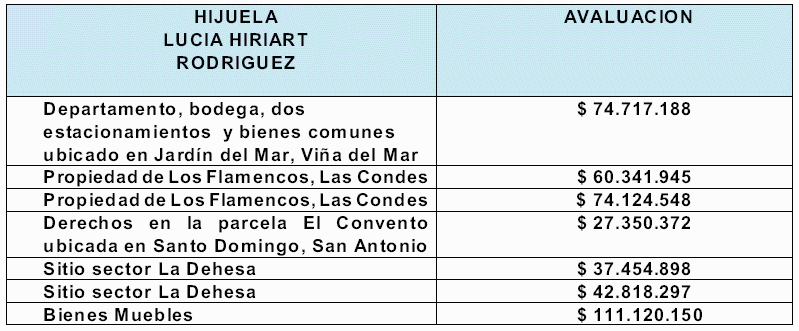 a.- María Lucía HIRIART RODRIGUEZ (sin actividad comercial, sin ingresos independientes, sin registro de contribuyente y sin presentar Declaraciones de Impuestos Anual a la Renta ante el Servicio de Impuestos Internos) adquirió propiedades y vehículos antes de la separación de bienes, manteniendo hasta la fecha las siguientes: Los Flamencos Nro.3796, Las Condes; Los Flamencos Nro.3818, Las Condes; Sitio 11-B de la Manzana A, Parcela Nro.03, sector La Dehesa; Sitio 12-A de la Manzana A, de los Nogales de La Dehesa, comuna de Las Condes; 2/7 de la Parcela Nro.09 Hacienda El Convento comuna de Santo Domingo (Los Boldos), ingresos respecto de los cuales no tributó cónyuge, al figurar a su nombre y no tener la calidad de contribuyente quedaba excluida de la revisión anual respectiva por parte del Servicio de Impuestos Internos.